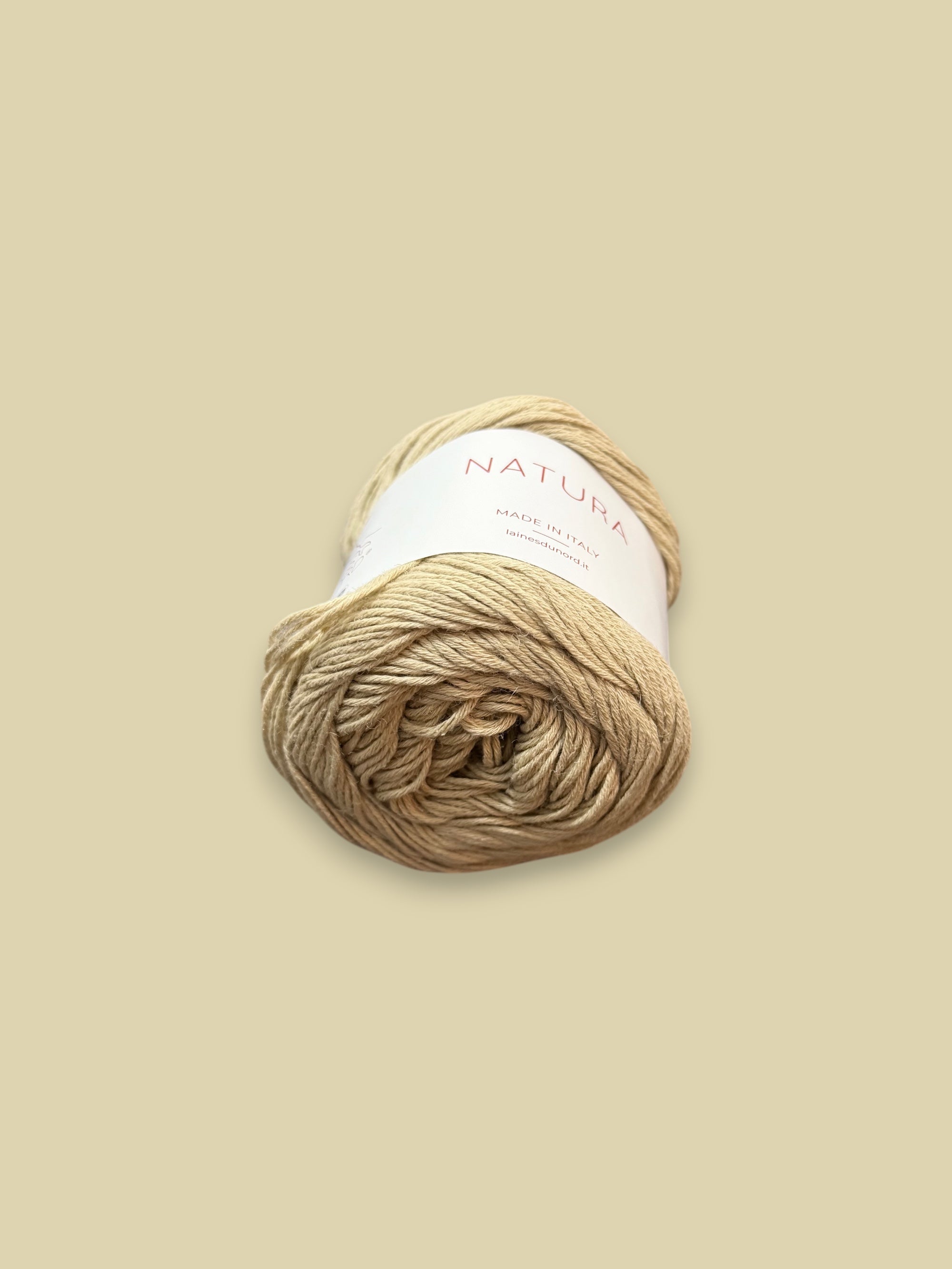 Die Natura von Laines du Nord ist ein sommerliches Naturgarn aus 50 % Baumwolle und 50 % Hanf. Diese Kombination verbindet die weiche, angenehme Haptik der Baumwolle mit der charakteristischen, leicht rustikalen Struktur des Hanfs. Dadurch entsteht ein Garn mit natürlichem Ausdruck und einem klaren Maschenbild.