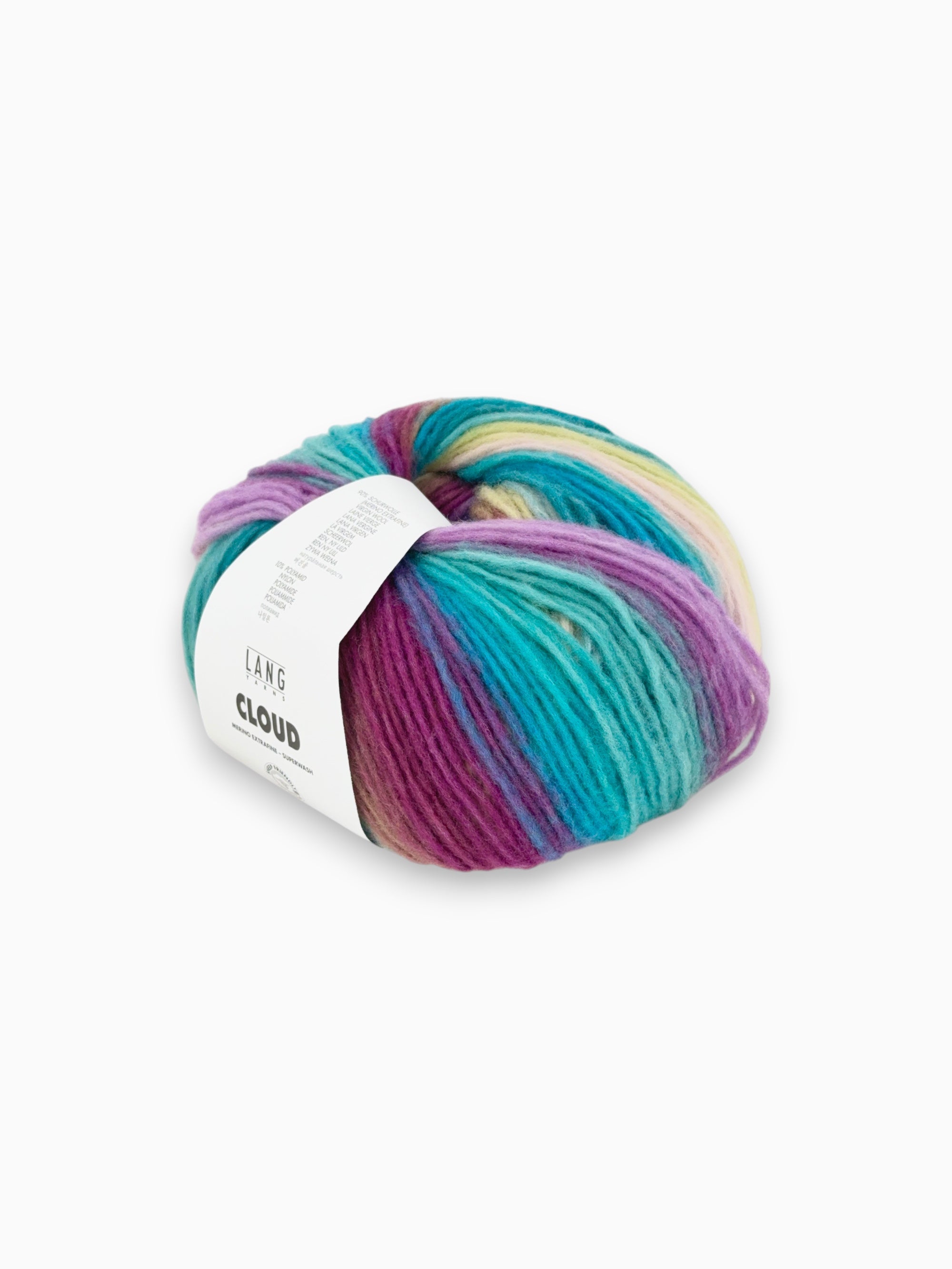 Lang Yarns Cloud ist ein wunderbar weiches Farbverlaufsgarn aus 90 % extrafeiner Merinowolle (mulesingfrei, Superwash) und 10 % Polyamid. Es fühlt sich leicht und voluminös an – ideal für Projekte mit viel Komfort und Charakter. Die Farbverläufe wechseln abwechslungsreich und harmonisch – mal leuchtend, mal sanft – und bringen Bewegung und Ausdruck ins Maschenbild. Mit ca. 260 m Lauflänge pro 100 g-Knäuel und einer empfohlenen Nadelstärke von 7 mm lässt sich Cloud angenehm zügig verarbeiten. Für einen Damenpullover in Größe M reichen bereits vier Knäuel – also 400 g. Die Maschenprobe liegt bei etwa 13 Maschen × 20 Reihen auf 10 × 10 cm. Das Garn ist maschinenwaschbar bei 30 °C im Wollprogramm (ohne Weichspüler) und eignet sich ideal für farbenfrohe Projekte mit unkomplizierter Pflege – vom Oversize-Pullover bis zum Statement-Schal.