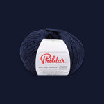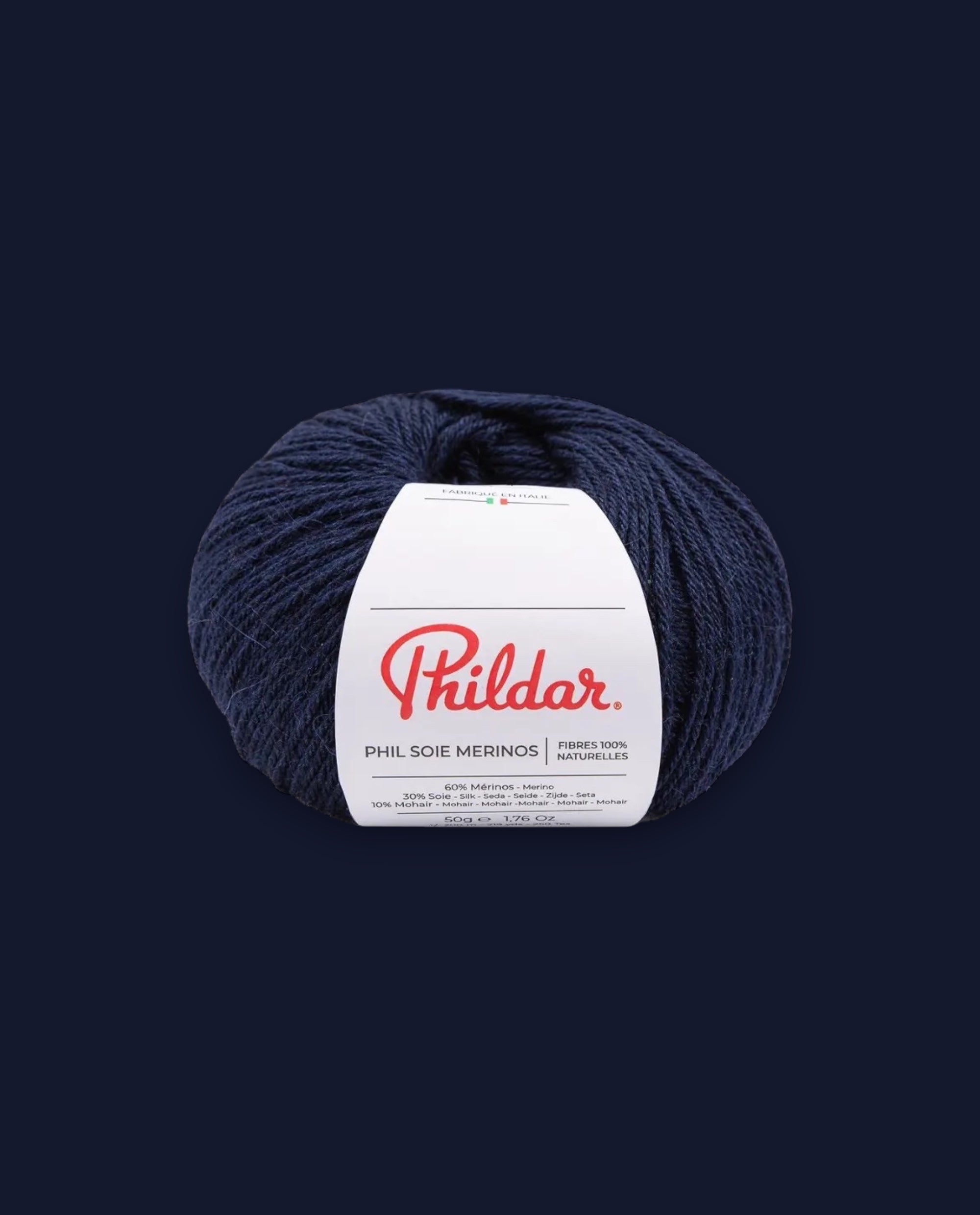 Farbe Marine ist ein tiefes Marineblau mit leicht melierter Struktur und feinen Hell-Dunkel-Nuancen, die dem Ton Lebendigkeit und eine ausgewogene Tiefe verleihen. In der Qualität Phil Soie Merino von Phildar entsteht daraus ein glattes Maschenbild mit feinem Schimmer, der das Dunkel edel auflockert – elegant, ausdrucksstark und zeitlos.
