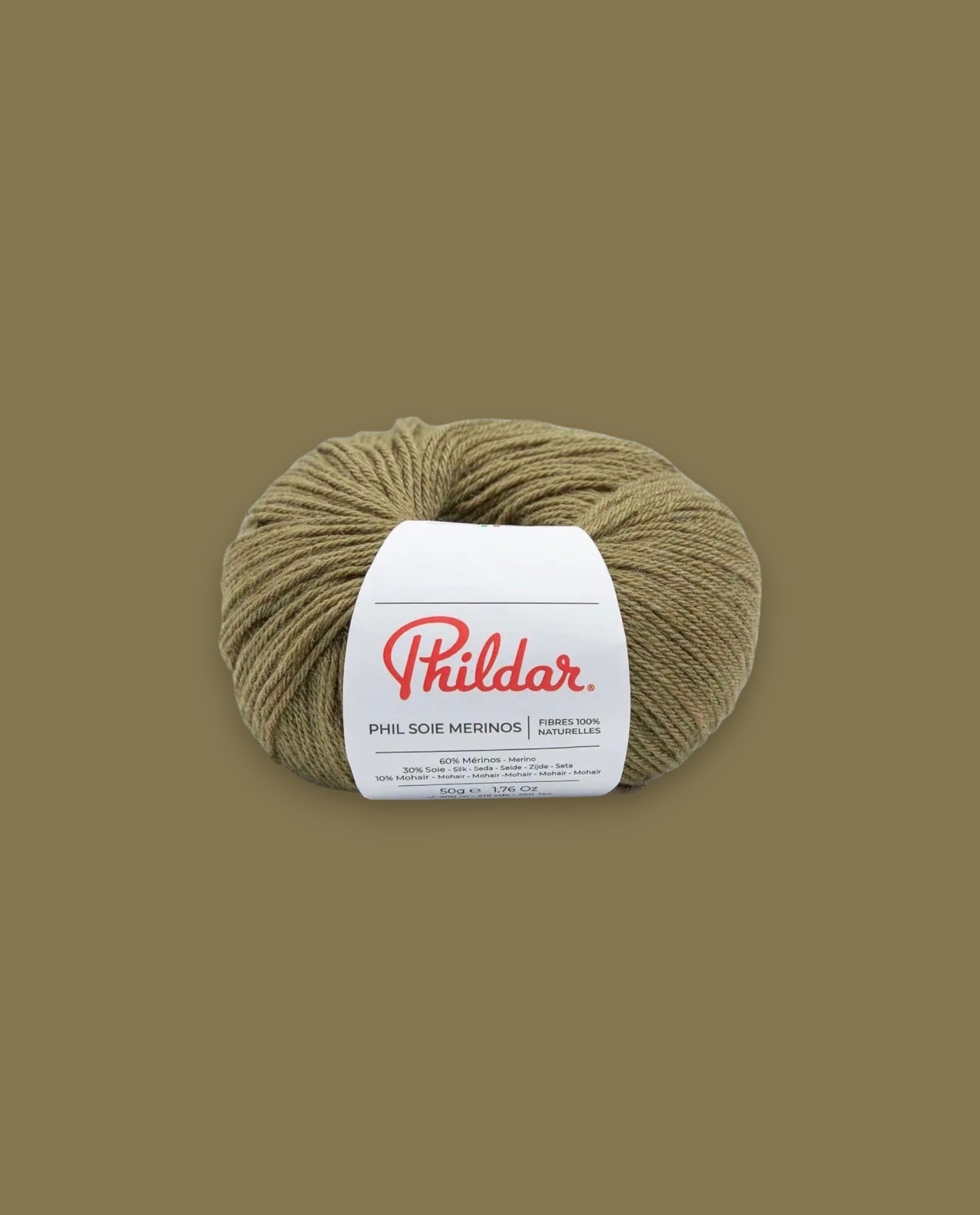 Farbe olive ist ein heller, gedämpfter Braungrünton mit natürlicher Tiefe und ruhiger Ausstrahlung. In der Qualität Phil Soie Merino von Phildar entsteht daraus ein glattes, gleichmäßiges Maschenbild mit feinem Schimmer, der den erdigen Charakter elegant unterstreicht – dezent, edel und vielseitig kombinierbar.