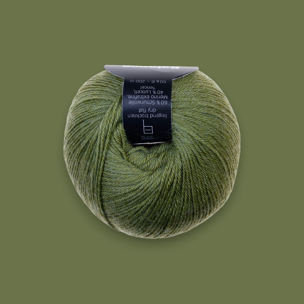 Farbe 21 ist ein gedämpftes Olivgrün mit einem sanft erdigen Unterton. Der Tencel-Anteil verleiht dem Ton Lebendigkeit und sorgt für einen sanften Glanz, der das natürliche, zugleich elegante Erscheinungsbild des Tons betont.