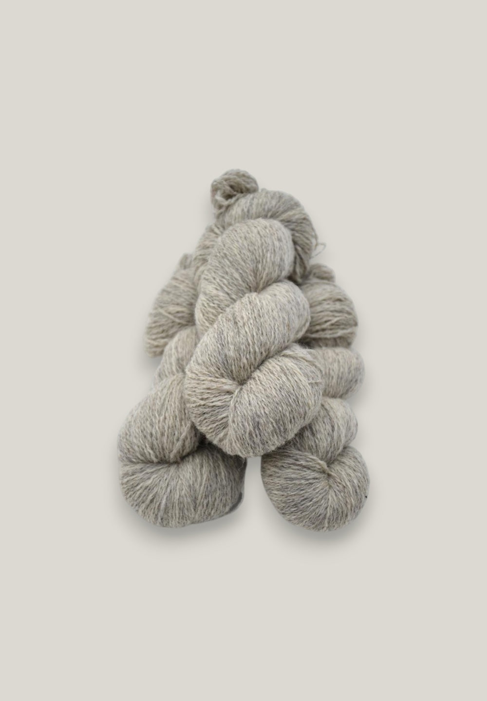 Farbe 6/2-0102 ist ein helles, natürlich meliertes Grau mit warmem Unterton. Gewonnen aus der Wolle schwedischer Gotlandschafe.