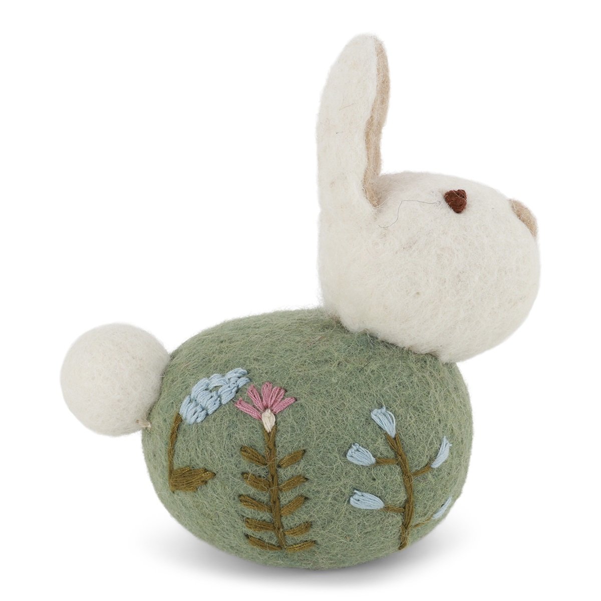 Sitzender gefilzter Hase mit Stickerei / Blume grün