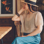Das Lily Sheer Top strickst Du nahtlos von oben nach unten mit Nadelstärke 4mm (Abschlüsse 3,5mm). Zuerst formen Zunahmen die Sattelschulter, danach folgen Raglanzunahmen. Verkürzte Reihen nach dem Halsbündchen sorgen für eine angenehme Passform, i-cords an den Säumen für einen sauberen Abschluss. Irene’s Top ist gestrickt aus Soft Silk Mohair in der Farbe powder / pudder. Das Mohairgarn aus südafrikanischem Mohair mit Maulbeerseide von Knitting for Olive ist angenehm und perfekt für eine leichte Wärme an lauen Sommernächten.