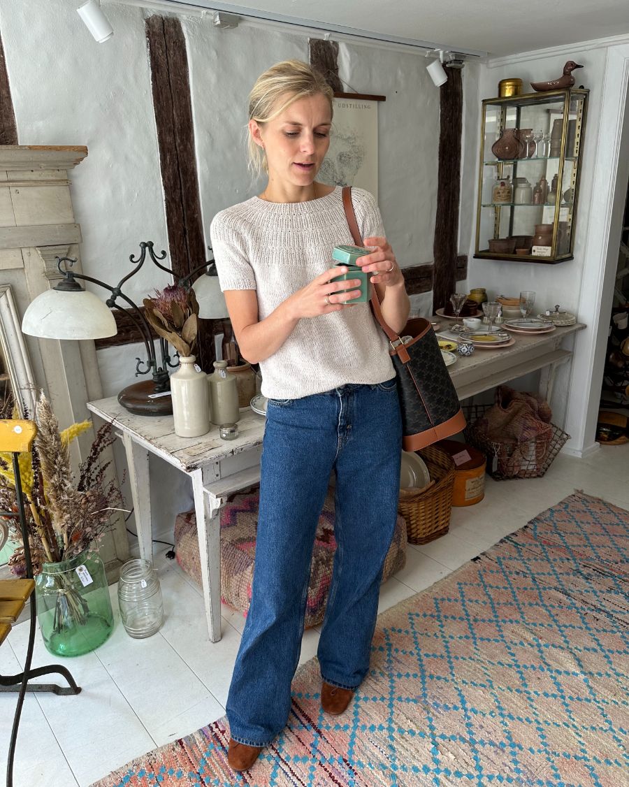 Die Ankers Sommerbluse von PetiteKnit strickst Du nachtlos von oben nach unten mit Nadelstärke 4mm (Bündchen 3,5mm). Die Rundpasse formst Du fast unsichtbar mit Zunahmen zwischen den Rippenmuster-Abschnitten, wobei danach noch ein kurzer Abschnitt mit Raglanzunahmen folgt. Mette’s Bluse ist gestrickt aus Line in der Farbe 1015. Die Baumwolle, Leinen, Viskose Mischung der norwegischen Marke Sandnes Garn ist herrlich griffig und lässt sich sehr gut verarbeiten.