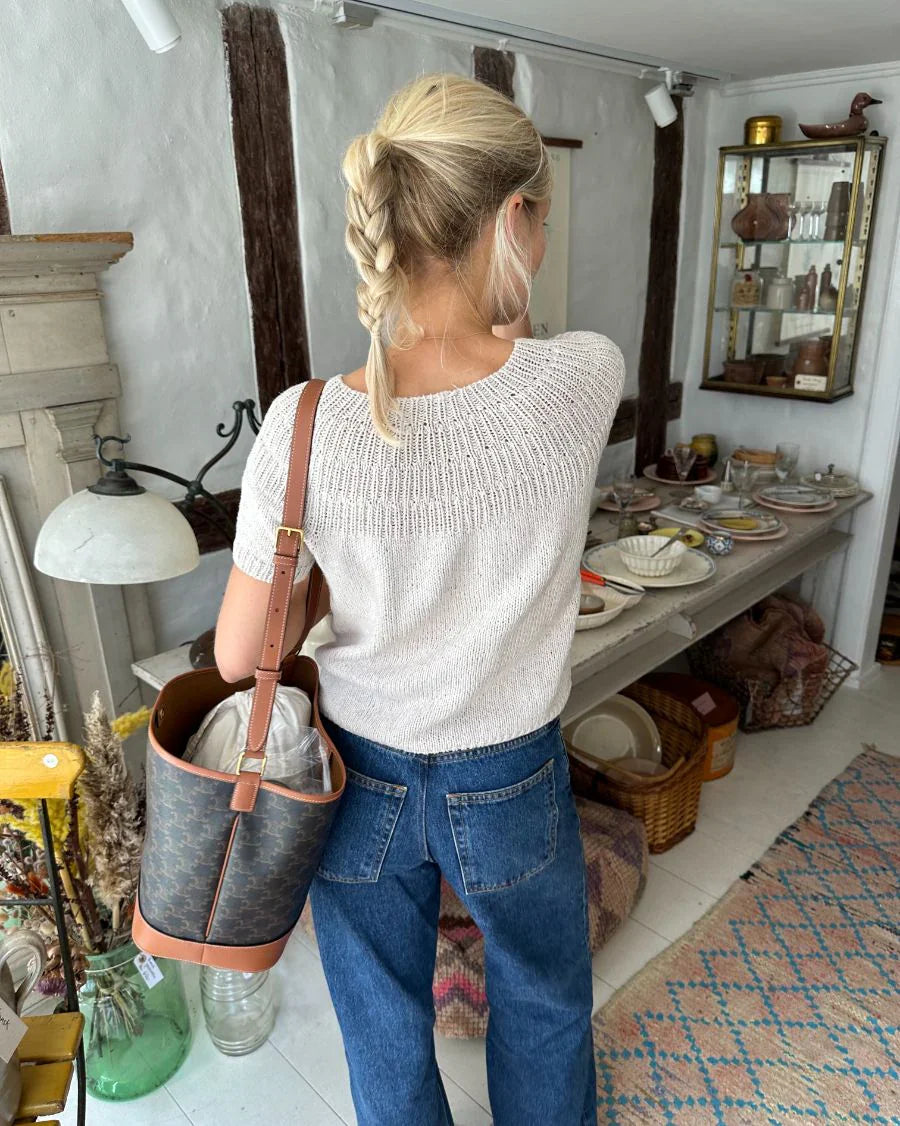 Die Ankers Sommerbluse von PetiteKnit strickst Du nachtlos von oben nach unten mit Nadelstärke 4mm (Bündchen 3,5mm). Die Rundpasse formst Du fast unsichtbar mit Zunahmen zwischen den Rippenmuster-Abschnitten, wobei danach noch ein kurzer Abschnitt mit Raglanzunahmen folgt. Mette’s Bluse ist gestrickt aus Line in der Farbe 1015. Die Baumwolle, Leinen, Viskose Mischung der norwegischen Marke Sandnes Garn ist herrlich griffig und lässt sich sehr gut verarbeiten.