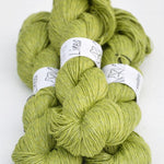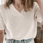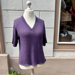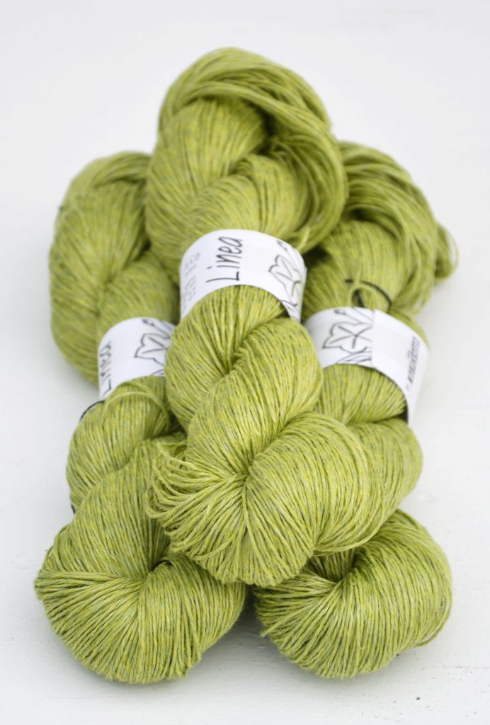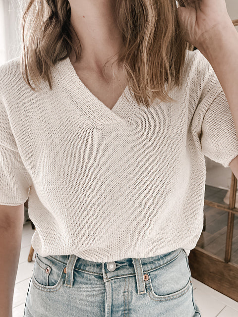 Das Moon Set Tee von Ozetta Knitwear strickst Du glatt rechts nahtlos von oben nach unten mit Nadelstärke 3,25mm (Maschenaufnahme mit 2,75mm). Bei der Passe mit sogenannten "Drop-Shoulders" strickst Du jeweils das Vorder- und Rückenteil für sich in Reihen, am Hals sorgen German short Rows (verkürzte Reihen) für eine bessere Passform. Ab den Armausschnitten geht’s dann weiter in Runden. Für die Ärmel nimmst Du am Schluss aus den Armausschnitten Maschen auf und strickst sie jeweils für sich herunter. Alle Kanten bekommen einen saubere i-cord Abschluss. Hailey’s Moon Set Tee ist gestrickt aus Pure Silk, wir haben uns dagegen hier für die Leinen-Baumwoll-Mischung "Linea" von Ullcentrum in der Farbe 487 (lila meliert) entschieden.